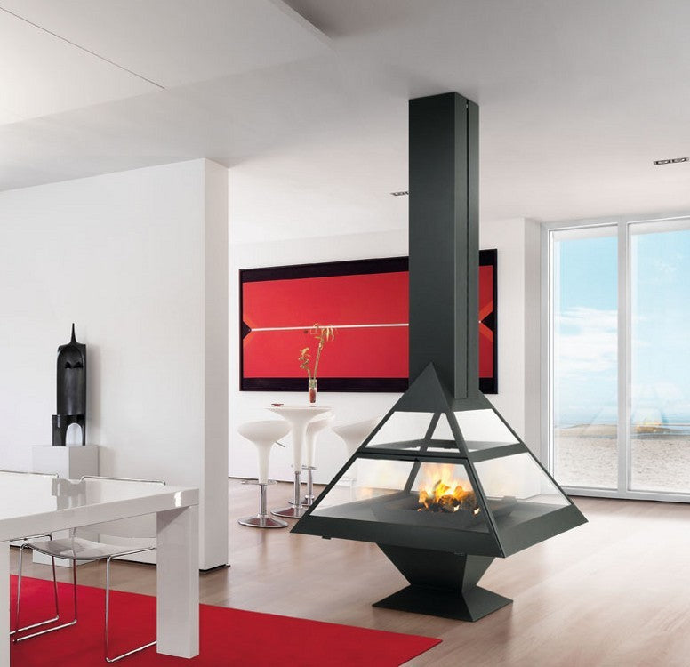 Estufa central de gas, diseño abierto para máxima visión del fuego.
