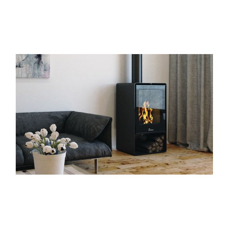Pensando en la comodidad y en la instalación en viviendas modernas, incluye de serie una toma de aire exterior de Ø 120 mm. El control del fuego es sencillo y preciso gracias a sus dos controles para la combustión. El diseño compacto se completa con la salida de humos superior y un práctico espacio inferior abierto para almacenar leña.