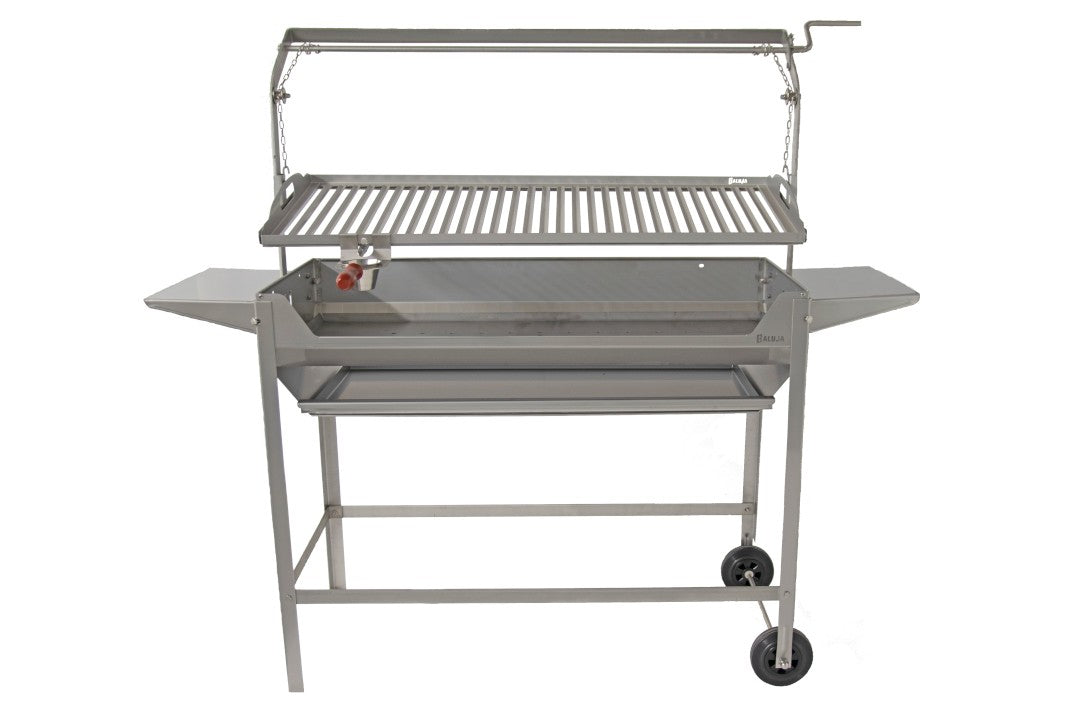 Parrilla de gran capacidad de acero inox AISI-304 de 1,5mm de grosor, regulable mediante un sistema de piñón.