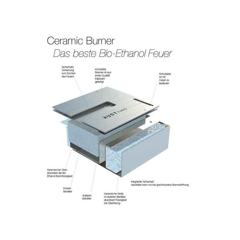 La piedra cerámica situada en su interior favorece un consumo reducido puesto que el quemador va consumiendo el vapor emanado del combustible caliente, y no el Bioetanol directamente.