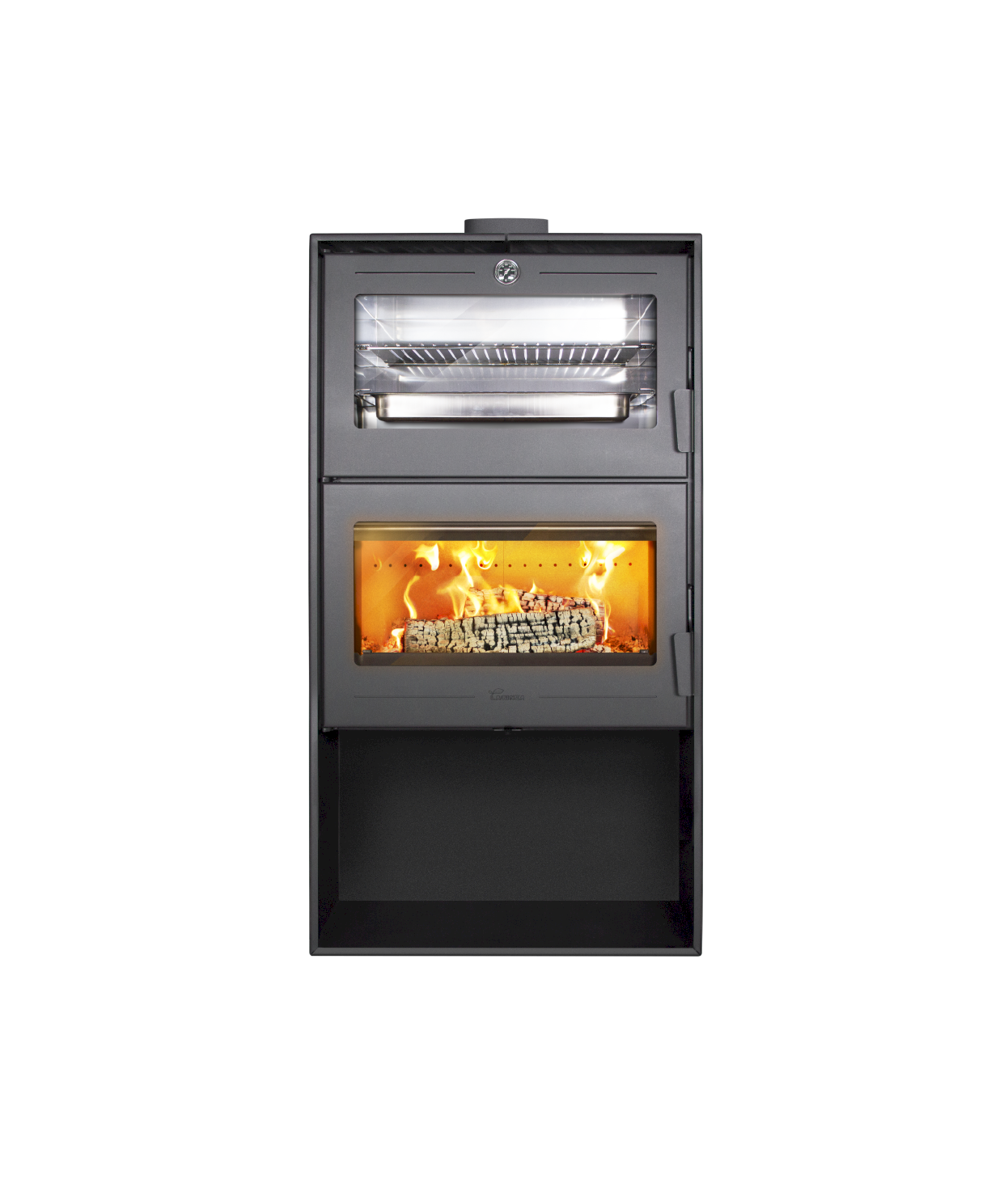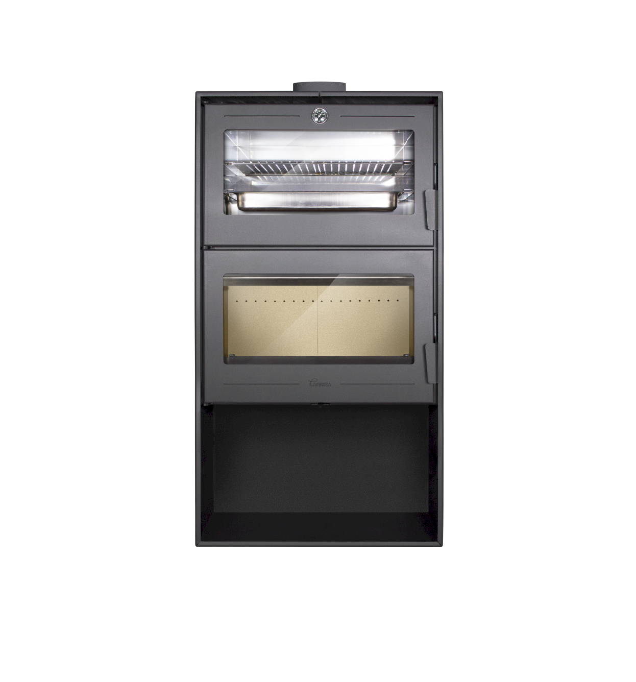 El hogar, ubicado bajo el horno, está revestido con vermiculita y utiliza una parrilla de fundición. La estufa está equipada con un sistema de doble combustión con control independiente, y el usuario puede controlar con precisión el fuego gracias a sus dos controles para la combustión. El diseño se completa con un práctico espacio leñero y la salida de humos superior. Como accesorio opcional, se ofrece el "Rincón Remate Superior".