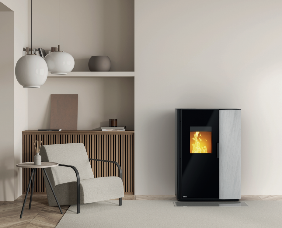 Puede elegir entre elegantes revestimientos como Acero negro, Esteatita y Piedra blanca, permitiendo personalizar la estufa a la estética de su hogar. Además, está disponible con conexión de salida de humos trasera o superior.