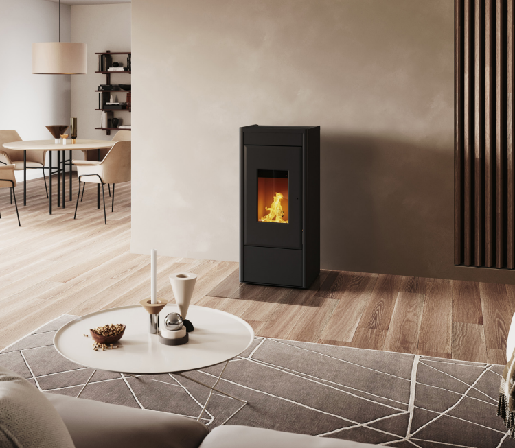 Su diseño minimalista, con revestimientos en Aluminio negro, permite integrarla discretamente en cualquier tipo de decoración. La estufa está diseñada con un sistema de aire independiente de la sala, lo que contribuye a una combustión más limpia y eficiente.