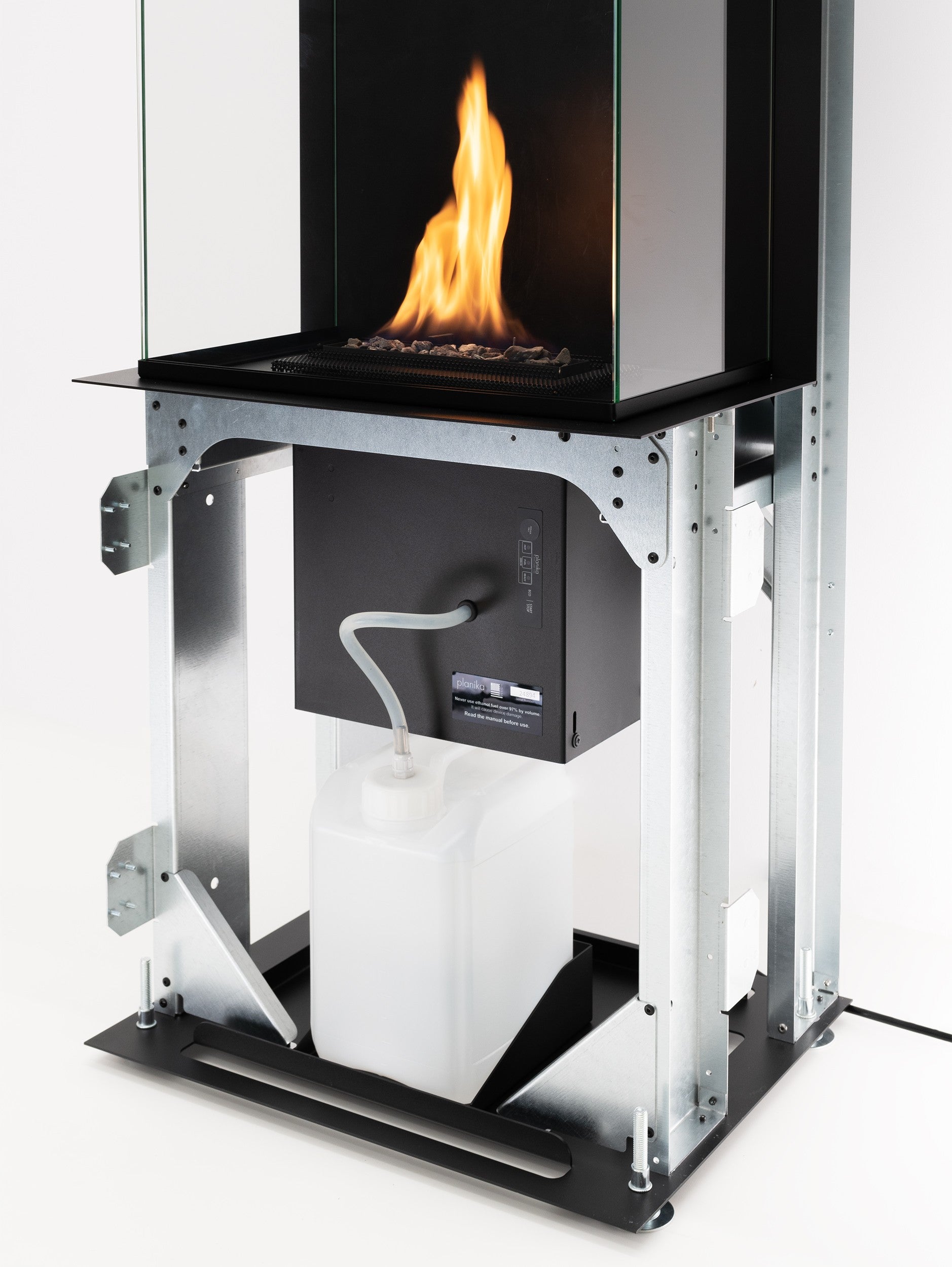 - BEV Technology : El innovador funcionamiento de los quemadores Planika consiste en la " gasificación del combustible", nos ofrece un consumo de combustible mínimo, y la seguridad adicional de que la linea de fuego no esta en contacto directo con el bioetanol ( solo consume el gas emitido ).