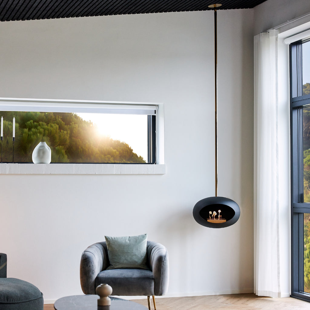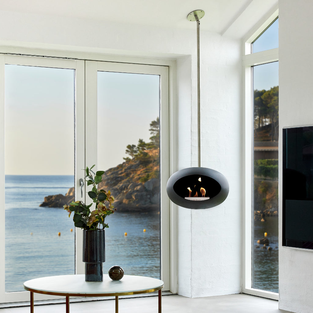 El modelo SKY es una chimenea decorativa de bioetanol para colgar del techo.