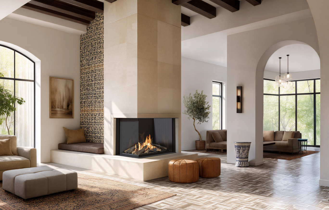 - Estructura Dual: Combina paneles de vidrio con un diseño de chasis elegante que define la silueta de la chimenea.
