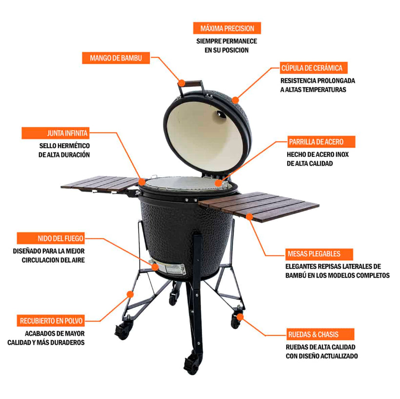 - Base para platos, deflector cerámico, cesto de carbón de acero inoxidable y recolector de cenizas de acero inoxidable.